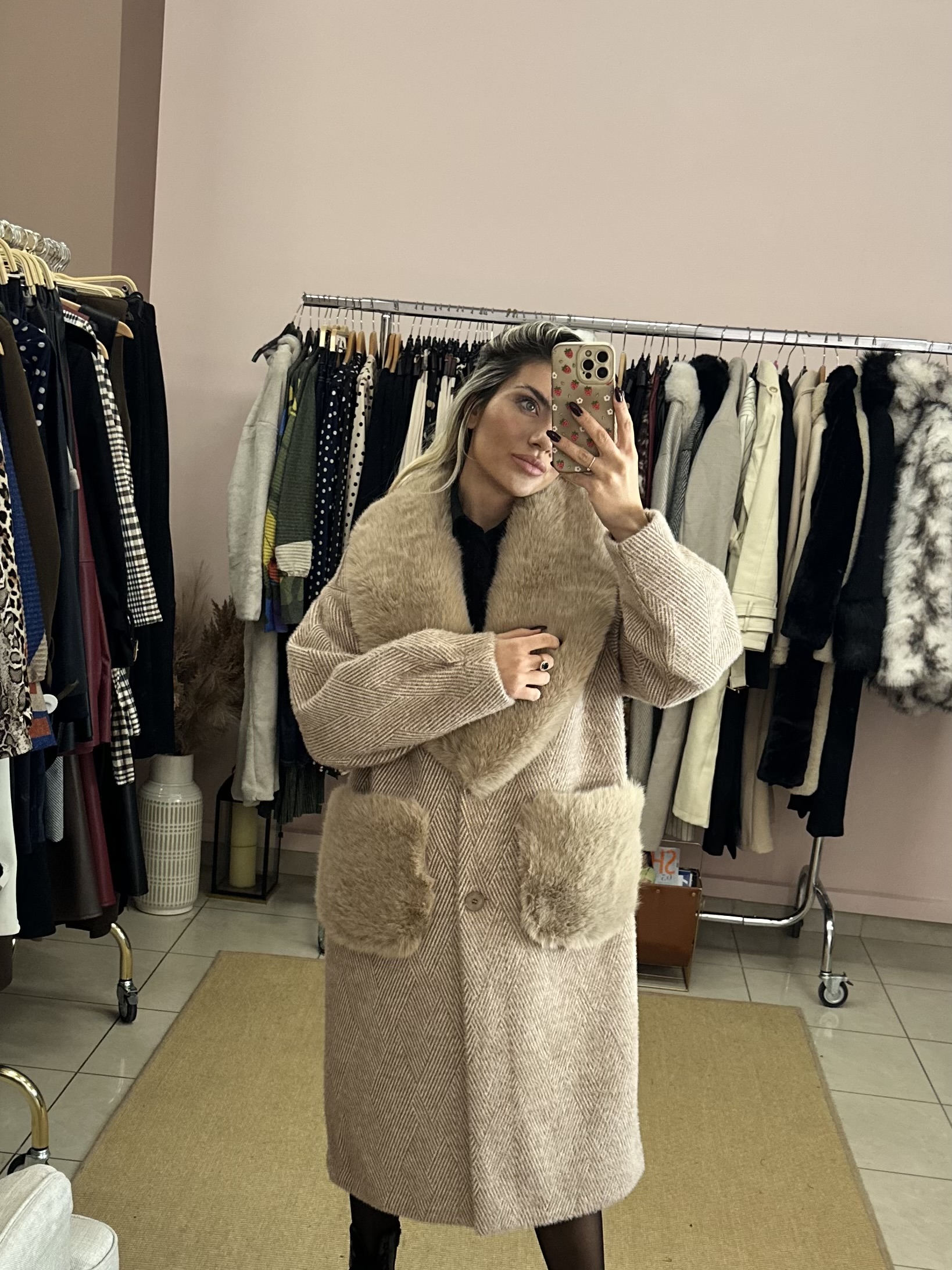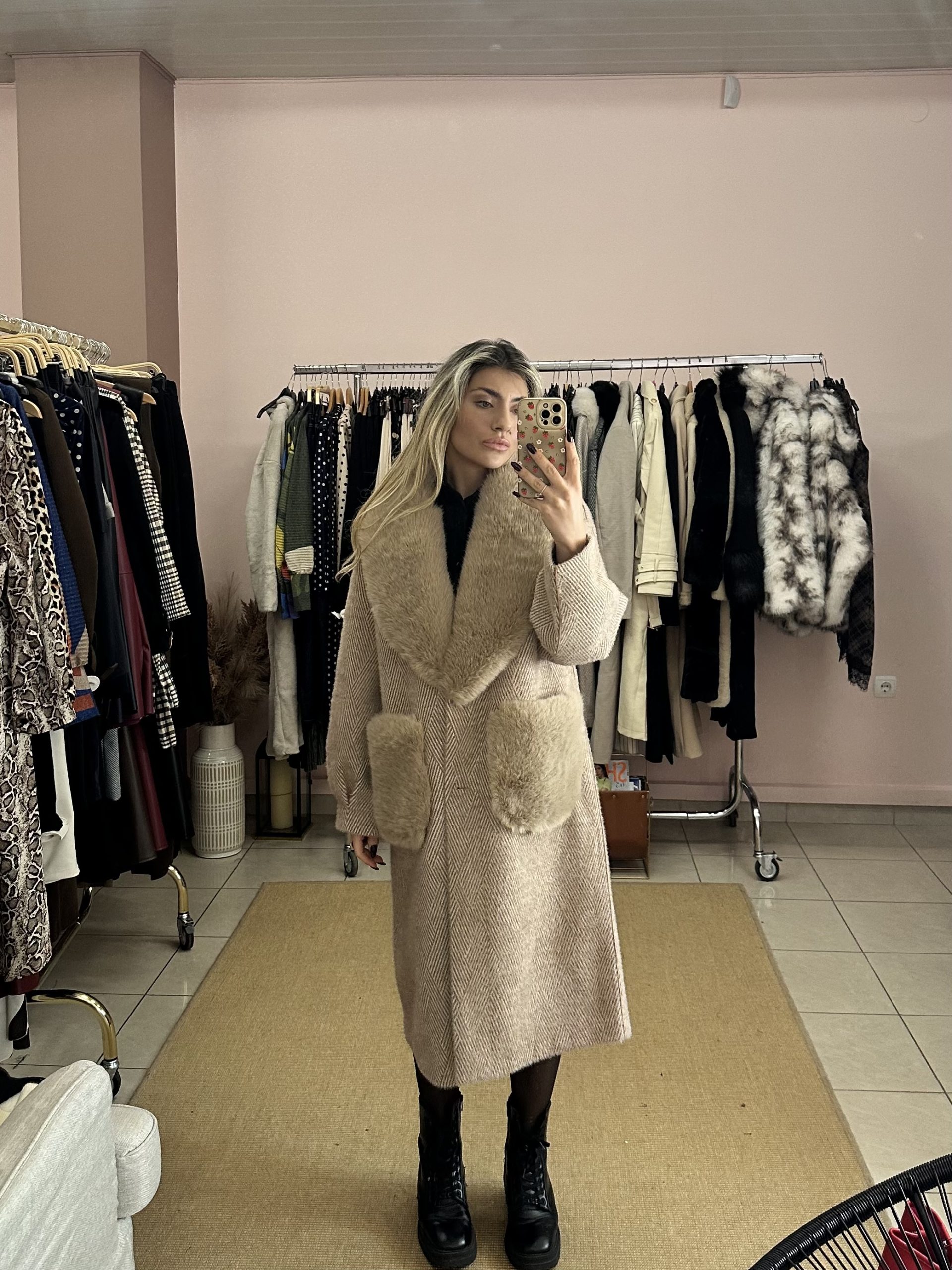 Αναβαθμίστε το χειμερινό σας στυλ με αυτό το υπέροχο oversized μάλλινο παλτό. Πολυτελής γούνα στον γιακά και τις τσέπες, φουσκωτά μανίκια και δύο εντυπωσιακά κουμπιά συνθέτουν ένα κομμάτι απαράμιλλης κομψότητας και ζεστασιάς.