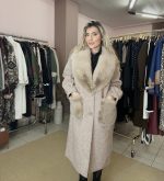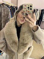 Τα φουσκωτά μανίκια χαρίζουν ένα παιχνιδιάρικο άγγιγμα, ενώ η πολυτελής γούνα που στολίζει τον γιακά και τις τσέπες προσθέτει μια αύρα ραφιναρισμένης πολυτέλειας.
