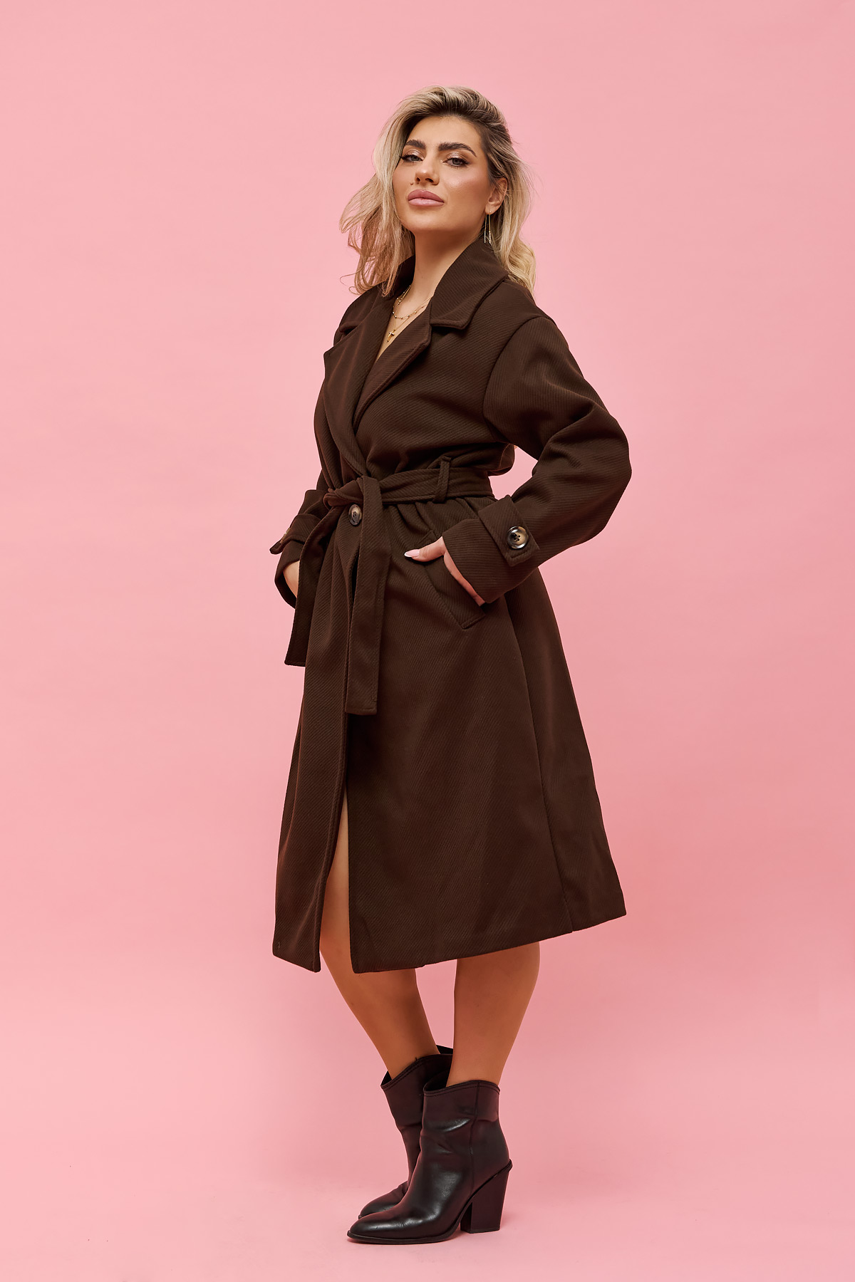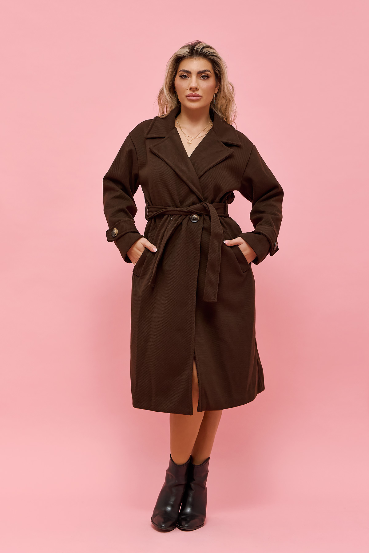 Κομψό και άνετο παλτό σε one size που καλύπτει έως XLarge. Η ζώνη στη μέση αναδεικνύει τη σιλουέτα, ενώ η minimal γραμμή και το μαλακό ύφασμα προσφέρουν άνεση και διαχρονικό στυλ σε κάθε εμφάνιση.