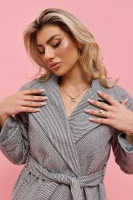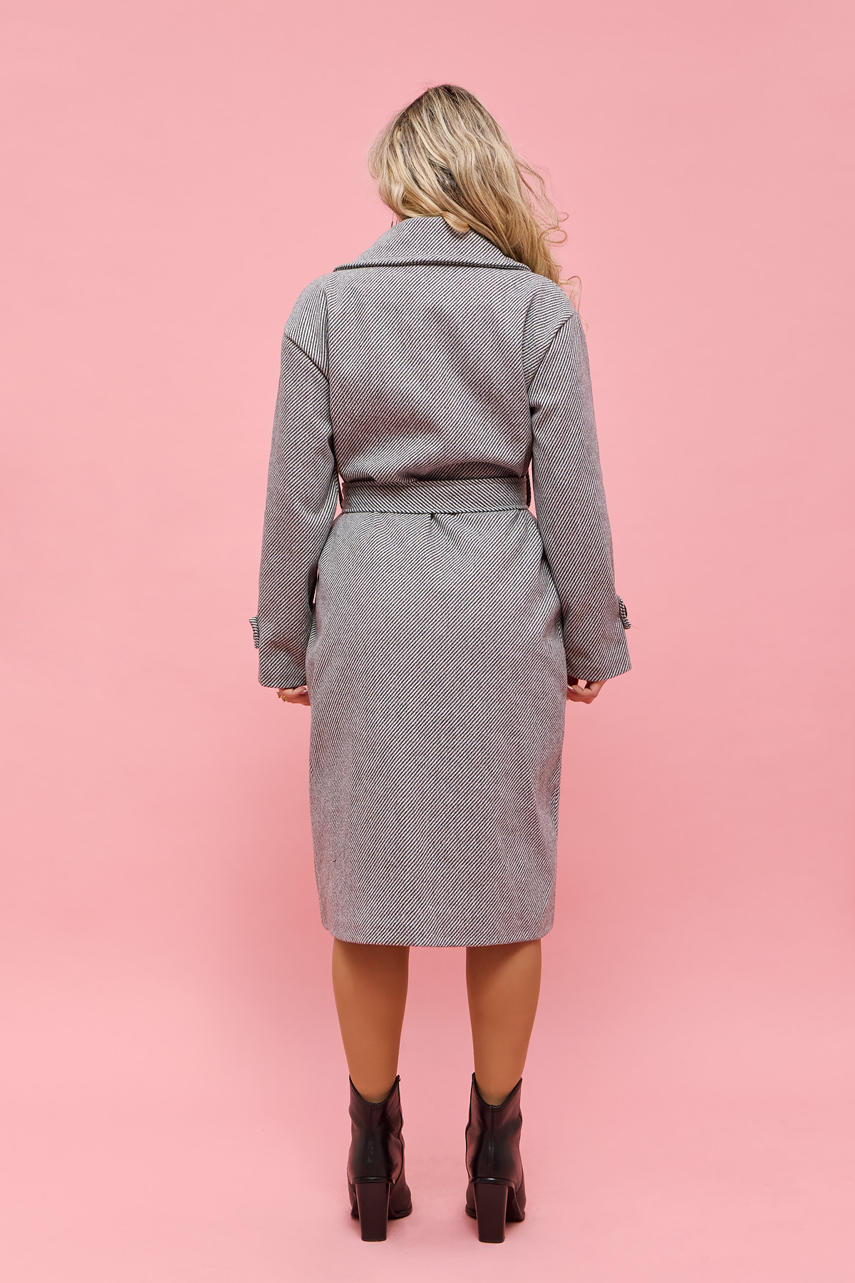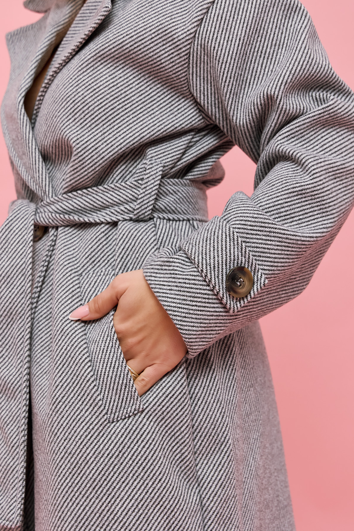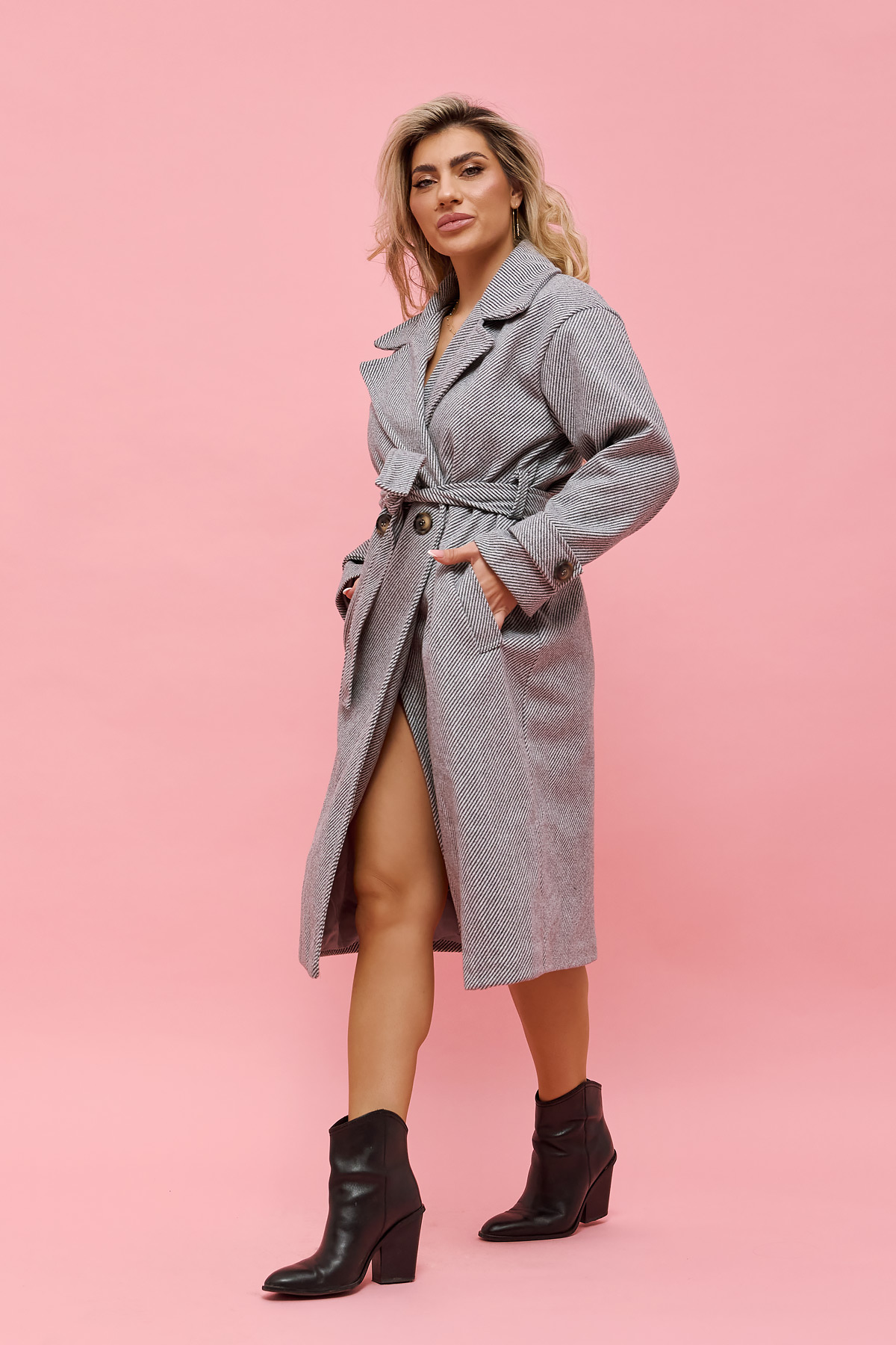 Η υφή του υφάσματος συνδυάζει ζεστασιά και πολυτέλεια, ενώ η καλοραμμένη γραμμή του χαρίζει κομψή σιλουέτα με φυσική κίνηση. Η ζώνη στη μέση επιτρέπει να τονιστεί διακριτικά η θηλυκότητα, ενώ ο δομημένος γιακάς και οι καθαρές γραμμές του σχεδίου αποπνέουν ισορροπία και αρμονία.