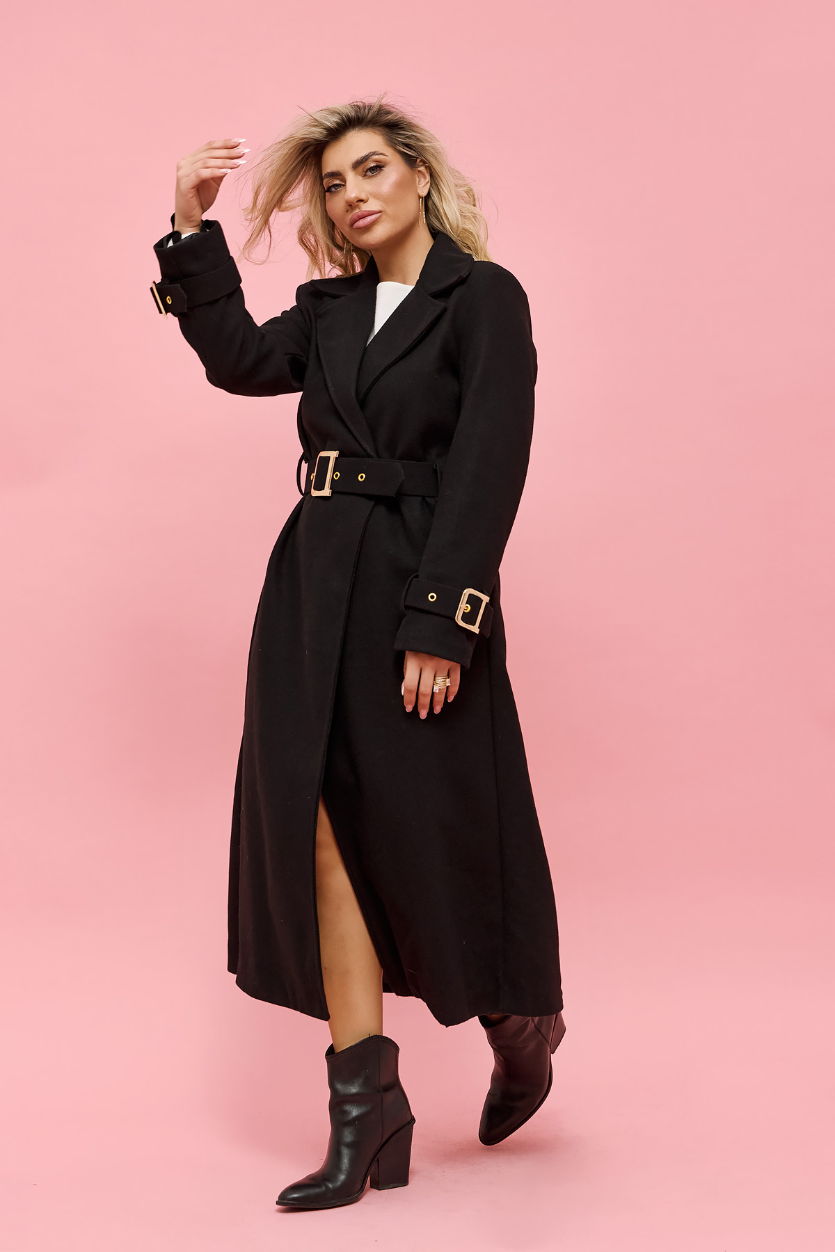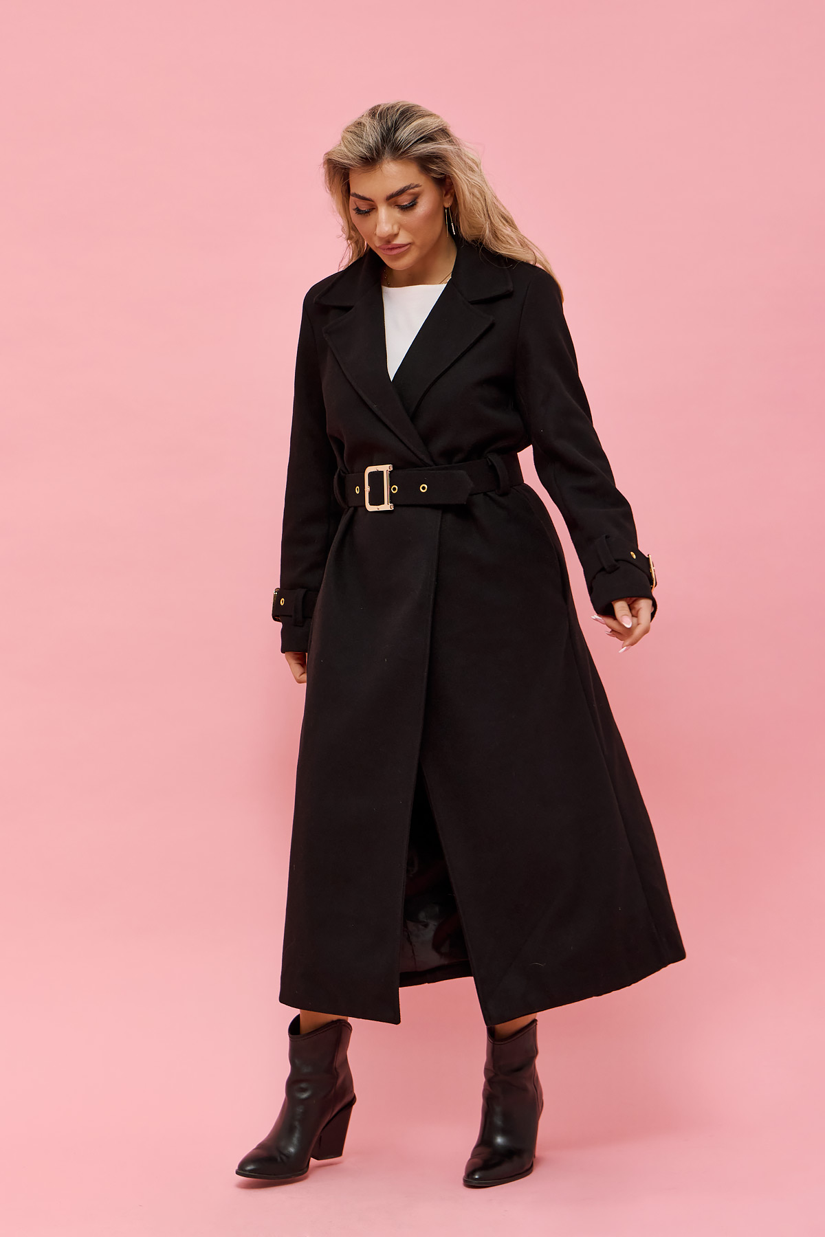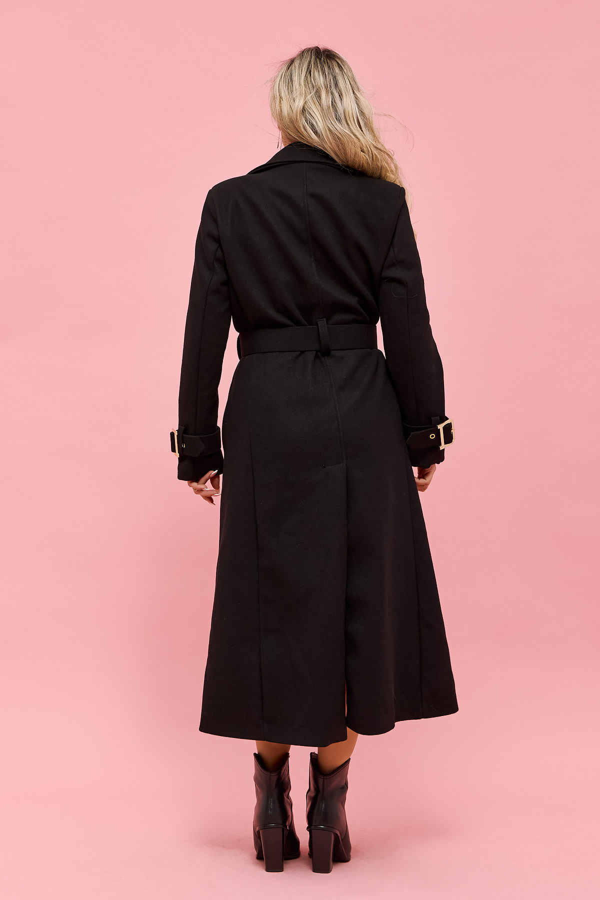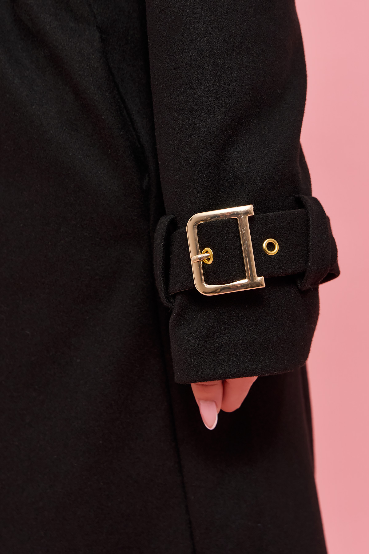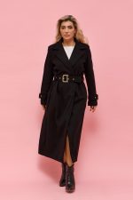 Εντυπωσιακό παλτό με ζώνη στη μέση και στα μανίκια, διακοσμημένες με κομψές χρυσές λεπτομέρειες. Προσφέρει άψογη εφαρμογή και προσθέτει μια διακριτική αίσθηση πολυτέλειας σε κάθε εμφάνιση.