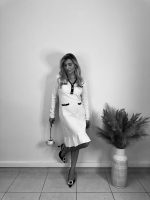 Οι διακοσμητικές λεπτομέρειες με χρυσά κουμπιά στο στήθος και τις τσέπες προσθέτουν διακριτική πολυτέλεια, ενώ οι μαύρες χάντρες και οι πούλιες που στολίζουν το ντεκολτέ δημιουργούν ένα παιχνίδι λάμψης που δεν περνά απαρατήρητο.