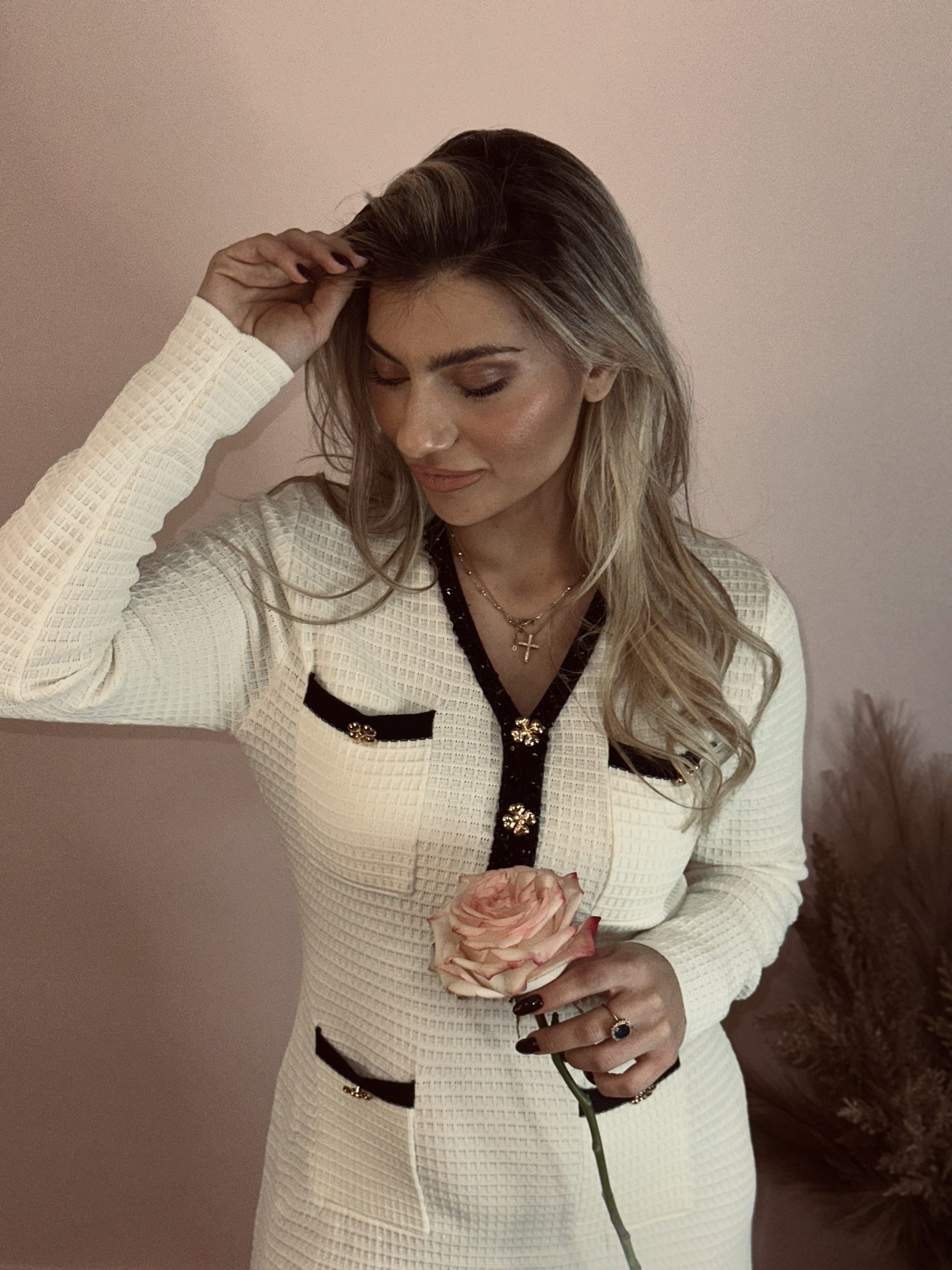 Εντυπωσιακό πλεκτό φόρεμα με χρυσά κουμπιά, μαύρες χάντρες και πούλιες στο ντεκολτέ. Το φραμπαλά τελείωμα χαρίζει κίνηση και θηλυκότητα σε κάθε σας εμφάνιση.